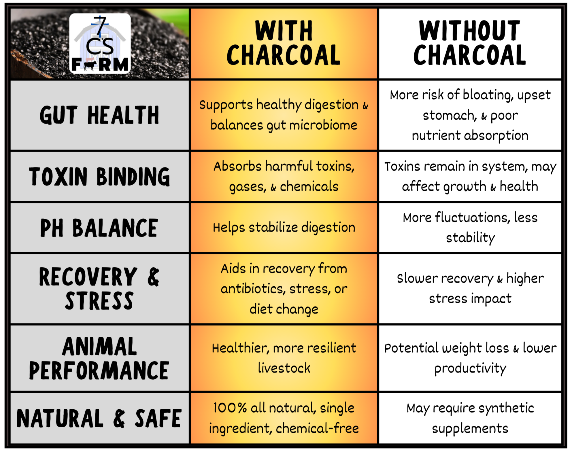 Our all-natural animal charcoal is specially prepared to support the well-being of livestock, pets, and poultry. For centuries, charcoal has been valued as a safe, effective way to promote digestion, balance gut health, and naturally absorb unwanted toxins.